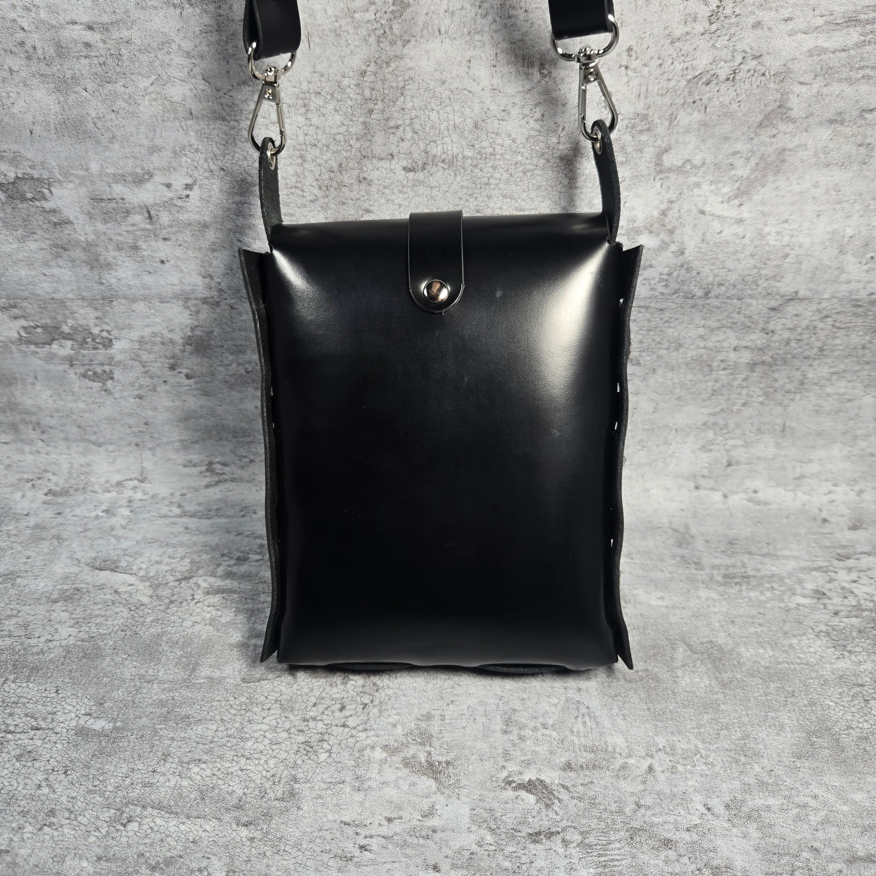 コンパクトでスマートなブラックレザーのショルダーバッグです。