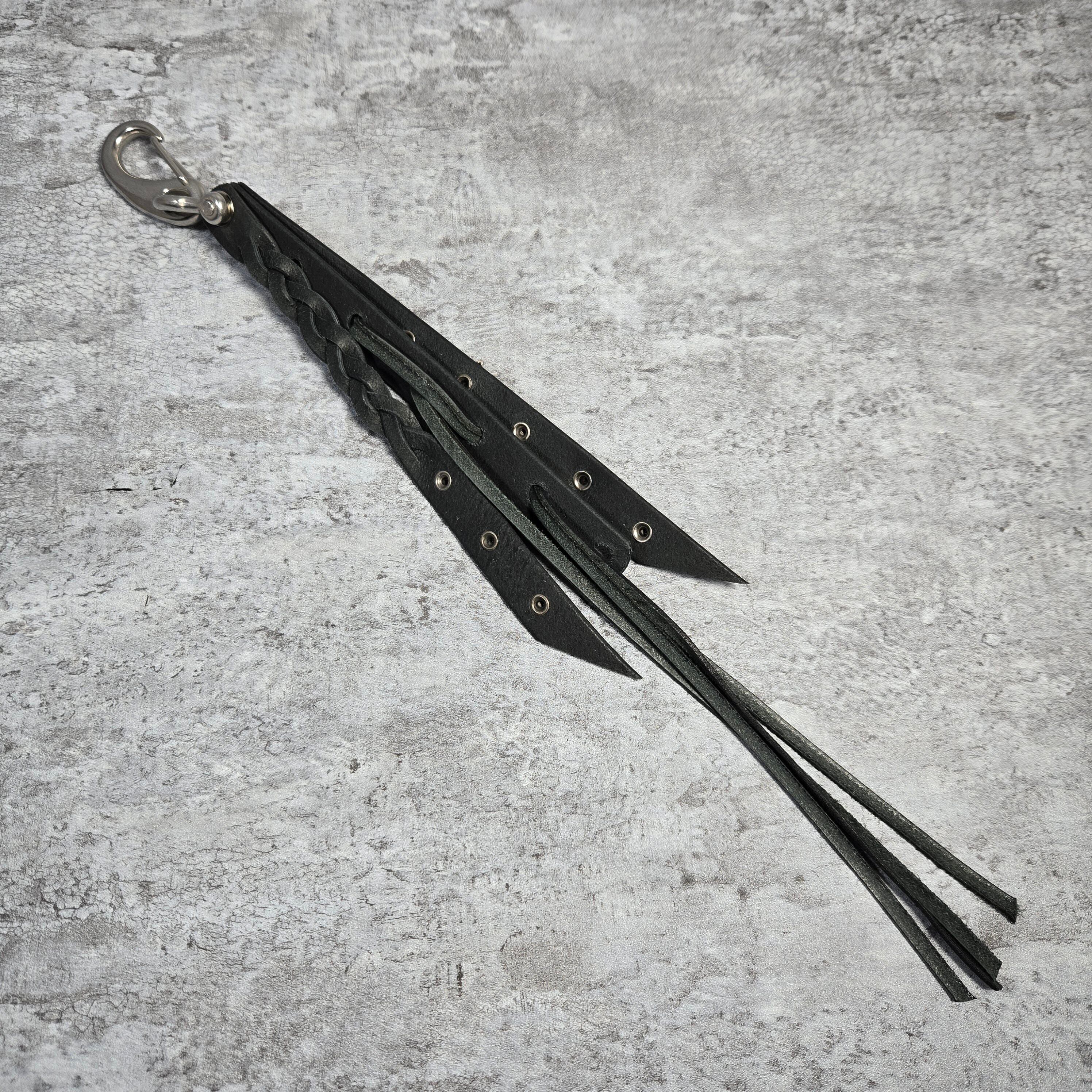 先端のレザーパーツや編み込みデザインがアクセントになり、バッグやベルトループに付けるだけでコーディネートのポイントになります。