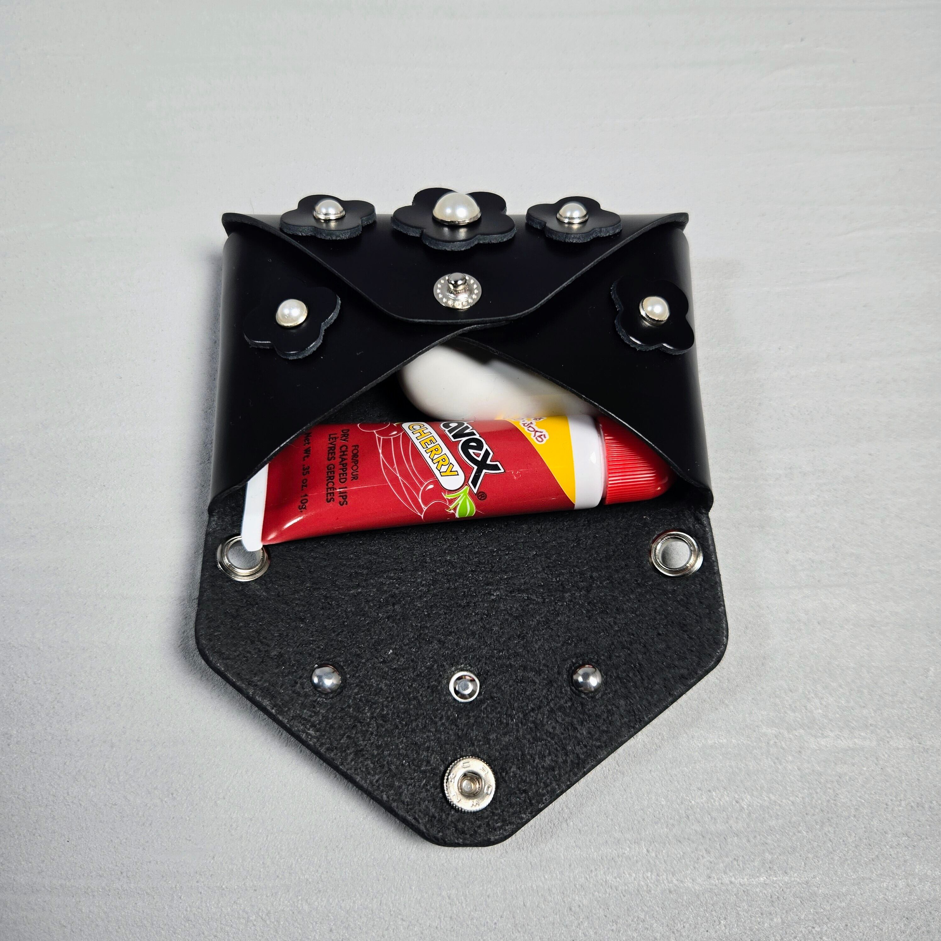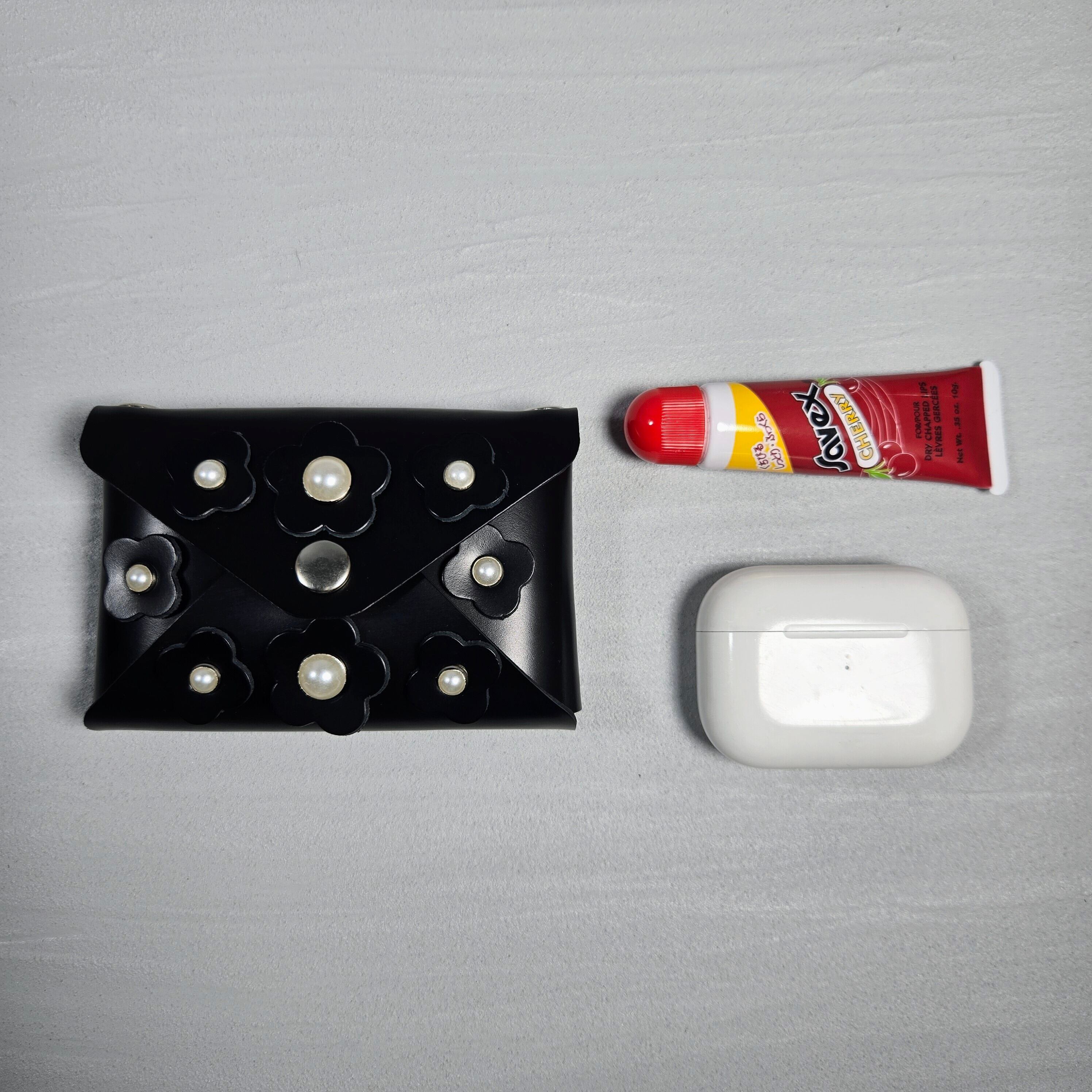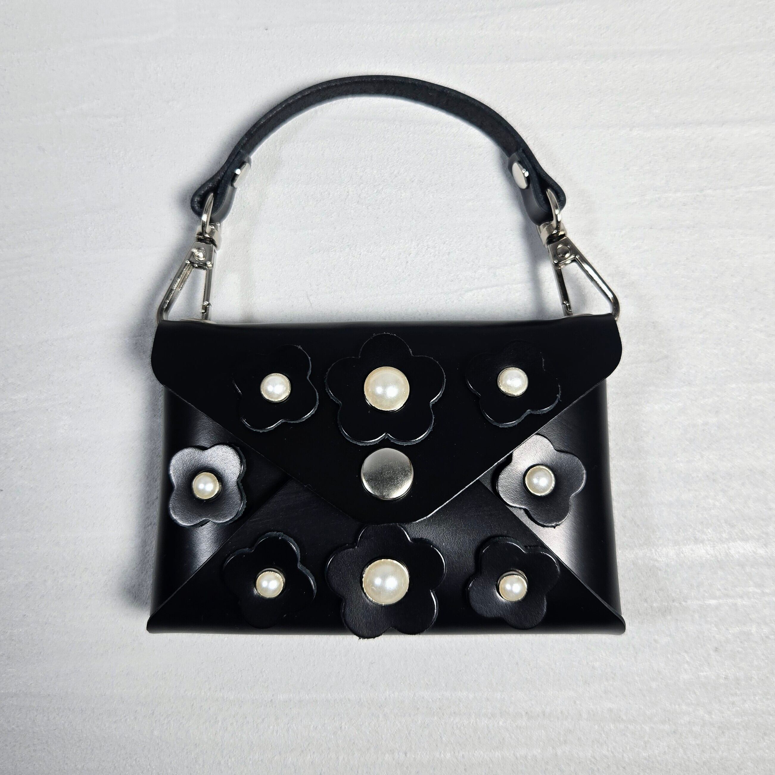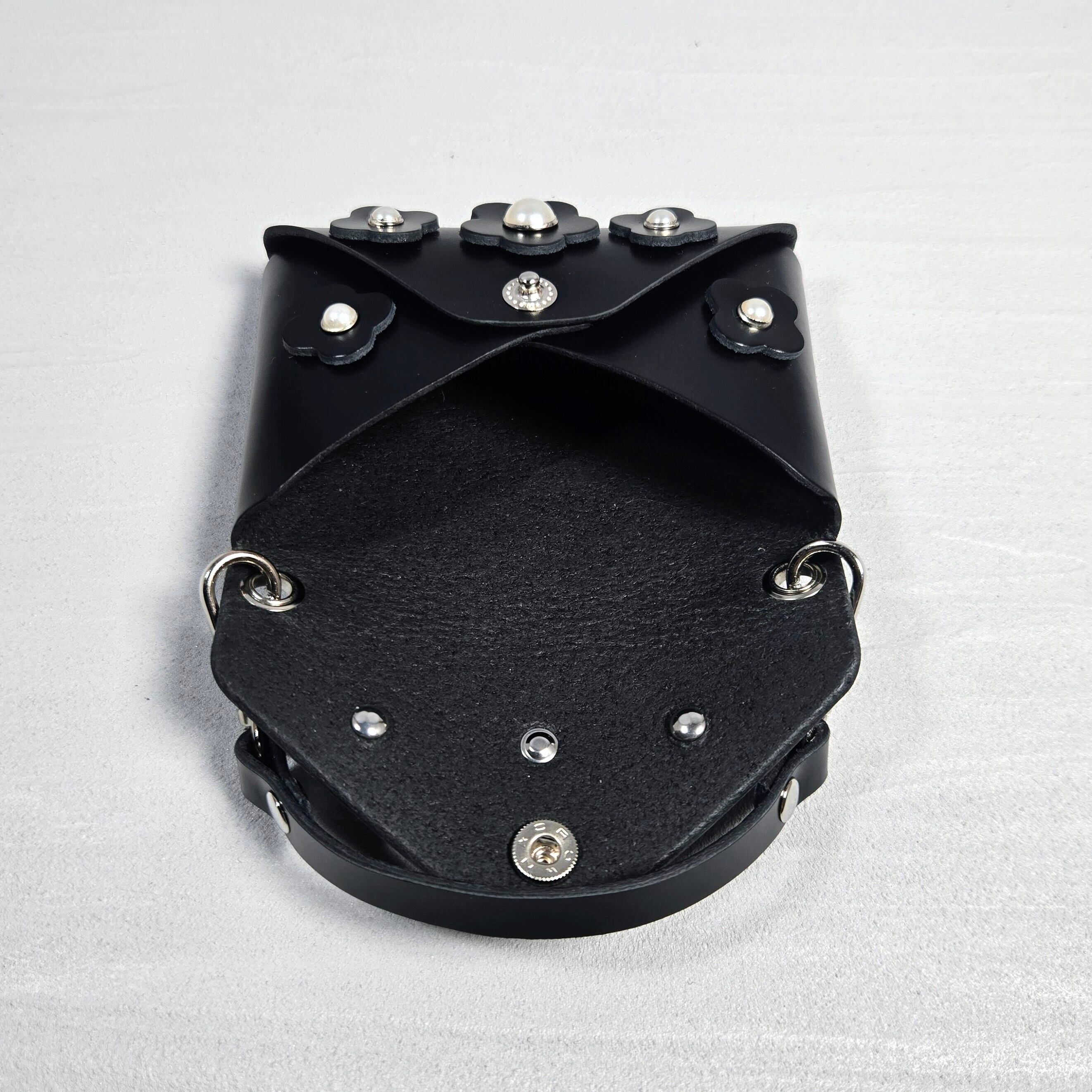 フラワーモチーフとパール調パーツをあしらった本革マルチケース。